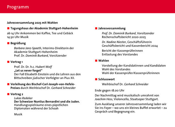 Zweiter Höhepunkt des Tages wird die Verleihung des Bischof-Carl-Joseph-von-Hefele-Preises sein. Preisträger ist in diesem Jahr Lukas Redeker mit seiner Studie „Ein Nuntius, der seine Hingabe an die Juden unter Beweis stellte“? Handlungsspielräume Filippo Bernardinis als Apostolischer Nuntius in der Schweiz zur Zeit der Shoah, deren Ergebnisse er uns in einem zweiten, kürzeren Vortrag vorstellen wird.