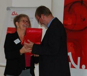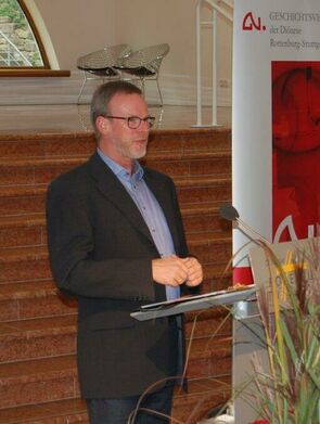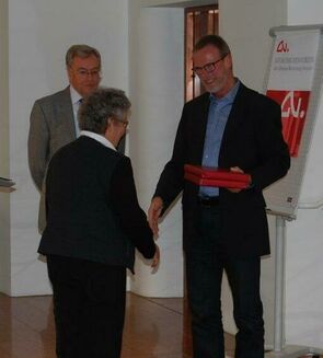 In den zehn Jahren Vorstandarbeit habe Andreas Holzem, so führte Vorstandsmitglied Claus Arnold aus, ehrenamtlich nicht nur vier wissenschaftliche Studientagungen konzipiert, realisiert, referiert und damit viele Themenschwerpunkte im Rottenburger Jahrbuch für Kirchengeschichte (RJKG) gesetzt. Er habe zudem diözesangeschichtliche Workshops für Studierende durchgeführt, sich immer wieder als Referent verpflichten lassen und in den Vorstandssitzungen wichtige Impulse gegeben. Seit 2008 habe er den Rezensionsteil des RJKG verantwortet und seit 2010 die Projektleitung für das Publikationsprojekt "Geschichte der Diözese Rottenburg-Stuttgart" übernommen. Beide Aufgaben wird er, wie Andreas Holzem im Vorfeld versichert hatte, weiterhin erfüllen. Das von der Geschäftsführerin überreichte Geschenk sei nur als kleine, symbolische Gabe zu verstehen, erklärte Maria E. Gründig und schloss sich dem Dank von Claus Arnold an.